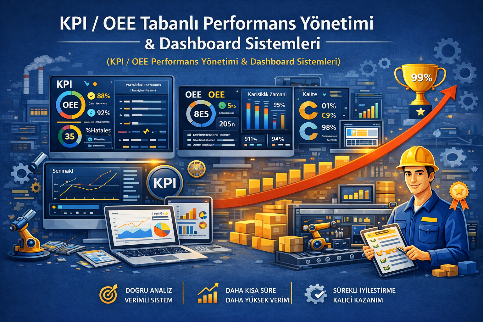 KPI / OEE Performans Yönetimi hizmetimizle işletmenizde kayıpların daha hızlı görünür hale gelmesini, kararların daha doğru alınmasını ve performans takibinin sürdürülebilir bir disipline dönüşmesini hedefliyoruz.
